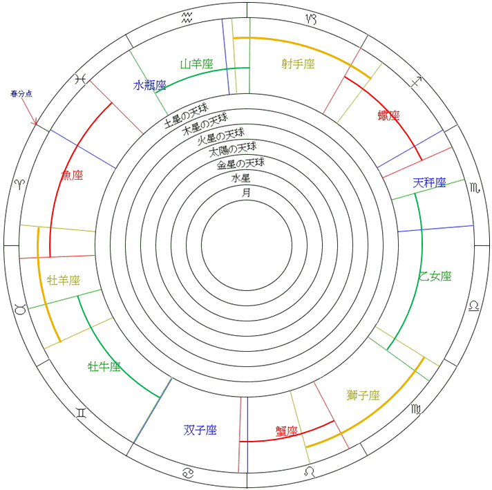 西洋占星術での惑星の並び順天球構造とカルディアン・オーダー その II■ 西洋占星術で使う天球構造 ◆ 占星術は、地球中心の天球構造を未だに使い続けています。 この天球構造の中に、惑星の並び順が見出されます。ここで見つけられる惑星の順番のことを、カルディアン・オーダーと呼びます。そして、惑星の定義がこれによって一部なされます。 ![]() ■ サインが一番外側 その下に恒星の天球があり、星座を形作っています。その下の、土星の天球から、惑星の天球が始まり、月まで続きます。これが、カルディアン・オーダーを決めています。 ● 様々な基礎になっている、カルディアン・オーダー カルディアン・オーダーは、西洋占星術の基礎の一部を成しています。例えば、ハウスの支配星はこの順番で受け持たされています。すなわち、一番外側の土星から順番に第1ハウス、2番目の木星が2ハウスを、3番目が火星ですから3ハウスを、太陽が4ハウス、金星5ハウス、水星6ハウス、月は7番目ですから第7ハウスとなっています。 第8ハウス以降は、元に戻って一番目の土星が、9ハウスは土星の次の木星が、10ハウスは火星、11ハウス太陽、最後の12ハウス金星と続きます。 この構造から、土星は惑星の一番外側ですから、1番とか、外側と内側の境界を示しているとか、静と動の軋轢とか、エネルギーの状態が正反対ですから、反対の意味を持つものと捉えらました。 配列そのものが、惑星にある種の意味を与える理由にもなっています。 ■ カルディアン・オーダーの役割 惑星を定義しています。 たまねぎ構造を見てみると、そこには天文学での、小惑星や矮(準)惑星が入り込む余地がありません。それらを、占星術上の惑星としてしまうと、カレンダーがいびつになります。 惑星の条件は、天球構造の1つを占めていること、時間の支配星になっていることです。 時には、天文学に準じなくても構いません。元々、占星学の方は、地球中心説を基本としているからです。 多くの占星術の本には星座のある天球を、春分点が少しずつ後ずさりをしていると書かれていますが、この説明は間違っています。天文学的には正しいです。でも、占星術の天球には、心変わりをしない神が存在しているのです。地球中心の天宮図が示すように、黄道帯十二サインは30度ずつで固定されていて、その内側を、星座がじりじりと前進しているのです。結果は同じ事でも、この構造を捉えているかいないかの考え方の、どちらが占星術的でしょうか。 占星術というのは、まったく天文学とは違う『思想』に基づいています。そのことも示すのが、この天球図です。 黄道帯十二サインは神の生成の4つの区分と3つの生成のモードで躍動します。4つとは、Hot & Dry の火の性質、Hot & Moistの風の性質、Cold & Dryの地の性質、Cold & Moist Hotの水の性質であり、3つとはカーディナル、フィクスト、ミュータブルです。4×3で、12のサインができます。 ちょっと過激な言い方をすると… 西洋占星術を勉強していながら、カルディアン・オーダーの話を聞いたことが無い方は、おそらくジャーナリズム用の太陽星座占いを勉強されていらっしゃるのだと思います。それはそれで一つのジャンルです。否定するつもりはありません。分析したり、将来を見据えたりするためのモノではなく、雑誌や新聞、楽しさあふれるエンターテイメントを演出する、『星占いの欄』に原稿を執筆するためのものです。 占星術をお手軽なものにするために、難しい話、カルディアン・オーダーの説明が削ぎ落とされています。 ■ 浮遊物体 小惑星● 小惑星郡は、知的に貪欲な論理的な占星家達のための格好の材料 占星術が唯物論のように感じられるのは、月の引力に代表されるように、惑星が我々に影響を与えているじゃないかという『力』、唯物論的な『力』に頭を奪われる結果です。 占星術の判断をしていると、宇宙との調和に感動を覚えることすらあります。 聞けば、小惑星の意味は、きっと海の向こうの多くの西洋占星家達がグループで、何千何百ものチャートを調べ上げて意味を決定し、そして世に発表しているんだ… なんてことを行う確たる統一機関があるようですが、占星術を趣味にしている貴方にさえその間の事情の連絡がないでしょうし、意味が決定され発表されたと言われますが、これも何も連絡がありません。とすれば、何かのグループが、それぞれ勝手にウェッブ上や論文で仮説として発表しているだけだと思って差し支えありません。あまりに限定的な意味でしかない可能性もあります。その小惑星の意味は、ひょっとしたらそうかもしれない… という程度です。 その人たちは、もっと明るい恒星を研究しているのでしょうか? まぁ、しているのでしょう。 小惑星は、何百万個もります。見つかる度に、意味探しという煩雑で多忙な忙しい占星術となりはてます。 既に年間1万個を超える小惑星(NEO小天体)が発見される時代になりました。年に数個の