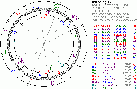 4ヶ月と書きましたが、3ヶ月でも5ヶ月でもそれはOKです。もともと占星術の時間というのはある程度巾があります。日本語でもよく言うじゃないですか、足かけ4年とか。この時期に現れている女性であればそれはほとんどチャートで示された女性と言っていいのではないでしょうか。 |
