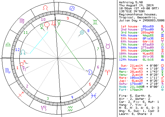 クライアントを表すルーラーはアセンダントのルーラー火星。そして、共同表示星として月です。相手の男性を示す惑星は、金星です。カスプの上にある木星も彼の星かもしれません。このチャートでは、木星を加えないとクライントの気持ちが見えてきません。したがって、木星も彼です。 |