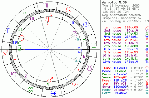 4ヶ月と書きましたが、3ヶ月でも5ヶ月でもそれはOKです。もともと占星術の時間というのはある程度巾があります。日本語でもよく言うじゃないですか、足かけ4年とか。この時期に現れている女性であればそれはほとんどチャートで示された女性と言っていいのではないでしょうか。 |
