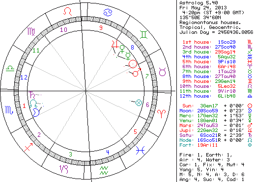 リセプションという概念は、ディグニティーと関連があります。一般的には、ディグニティーに関係があるのは表を使うところまでです。一般的では無い・・・ じゃあ、例外なのか、というと通常のことです。 アスペクトを観察すると、それはタイミングが示されます。 即断は許されない事なのですが、カレントと彼女の二人の関係が深みを増すとは言い難い場所に惑星が置かれています。特に水星(別の男性)と金星(彼女)のコンジャンクションは、別の男性との間の深い関係を示してしまうものです。 |